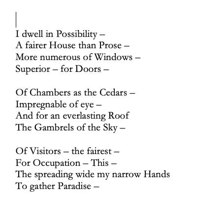 Gaps, spaces, and the unsaid. For Emily Dickinson, these aspects of a poem offer possibility. This idea is explored in her poem that begins, ‘I dwell in Possibility – '