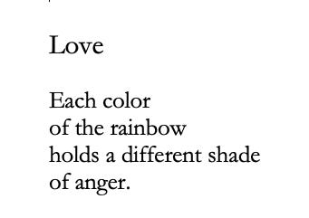 In other words, the rainbow signals contained wrath. And the title of my poem links this idea to an unsentimental way of understanding “love:” perhaps love, on its deepest level, must sometimes include holding back anger.