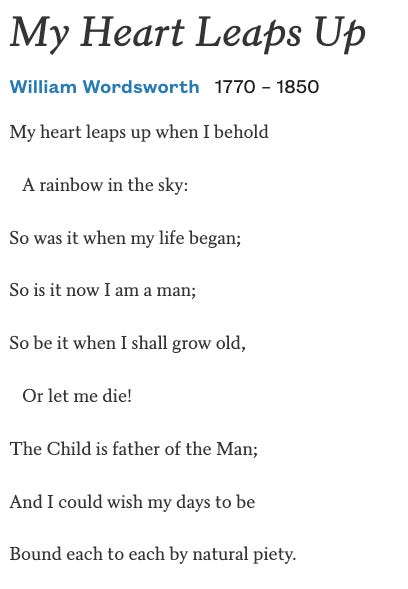 Wordsworth recalls this moment in his poem “My Heart Leaps Up”:
