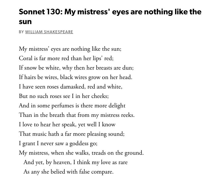Think of something in the world that is normally thought of as pretty. Perhaps a sunset or waterfall. Perhaps a cute fluffy animal. Or something outside of nature such as a beautiful sleek tall building or the perfect sports car. Delve into its opposite: can this element include cruelty, ugliness, anger, or something unpretty? See where this takes you. (Shakespeare’s sonnet 130 may be an inspiration: he describes a woman with unattractive qualities and his love for her).