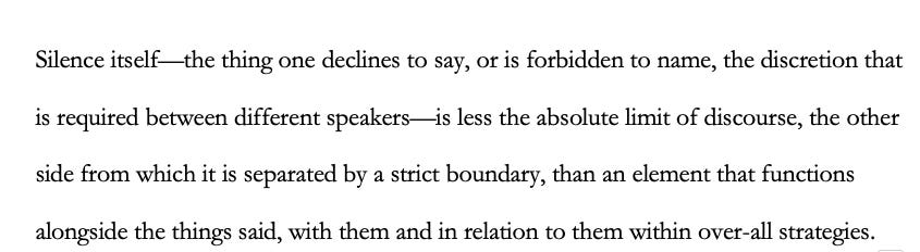 Since ‘discourse’ is Foucault’s term for the many ways society wields power over its members, when he writes that there is no boundary between silence and discourse, he suggests that silence is also a part of the oppressive system that will not allow truths to be communicated – if such truths even exist. He goes on to write that silences ‘are an integral part of the strategies that underlie and permeate discourses’. For Foucault, silence is another form of language, an element to deconstruct, a place to find meaninglessness; for him, silence, like words, is a slippery medium from which meaning cannot be found or communicated.