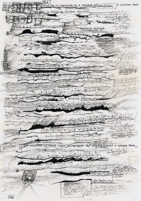 Artwork by Federico Federici. Writing in Response to a Request of a Written Text, pencil, ink, pigment liner, 2024 (Rome: Private Collection)