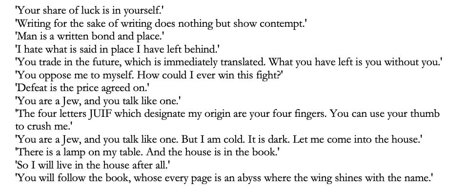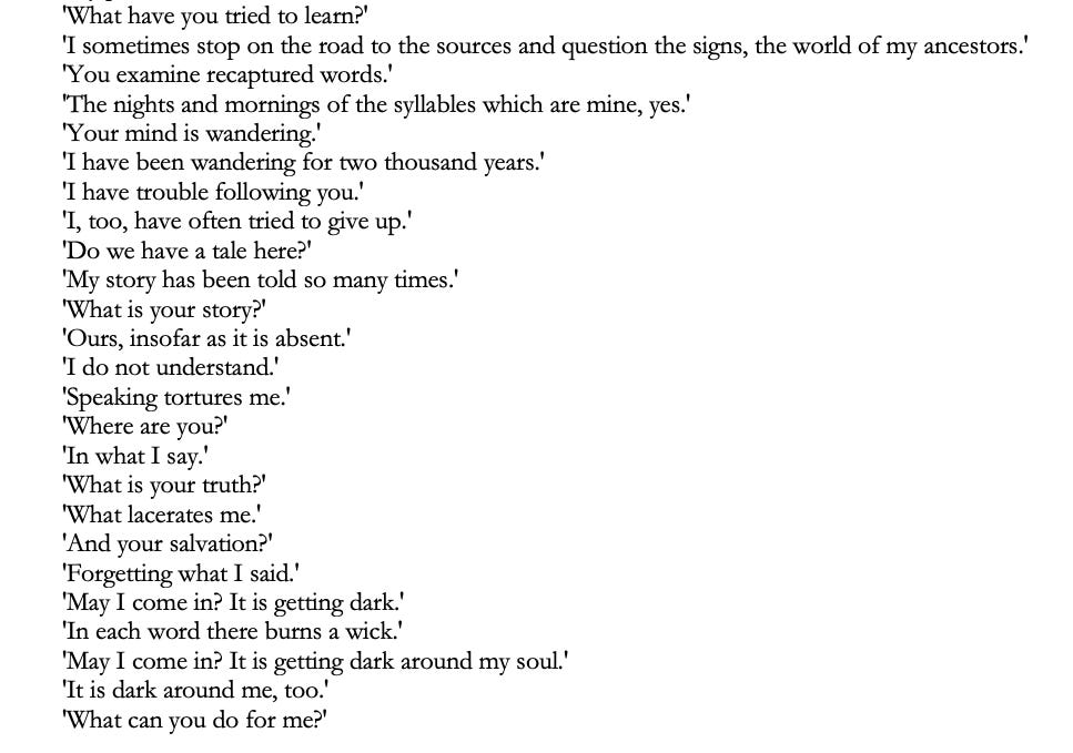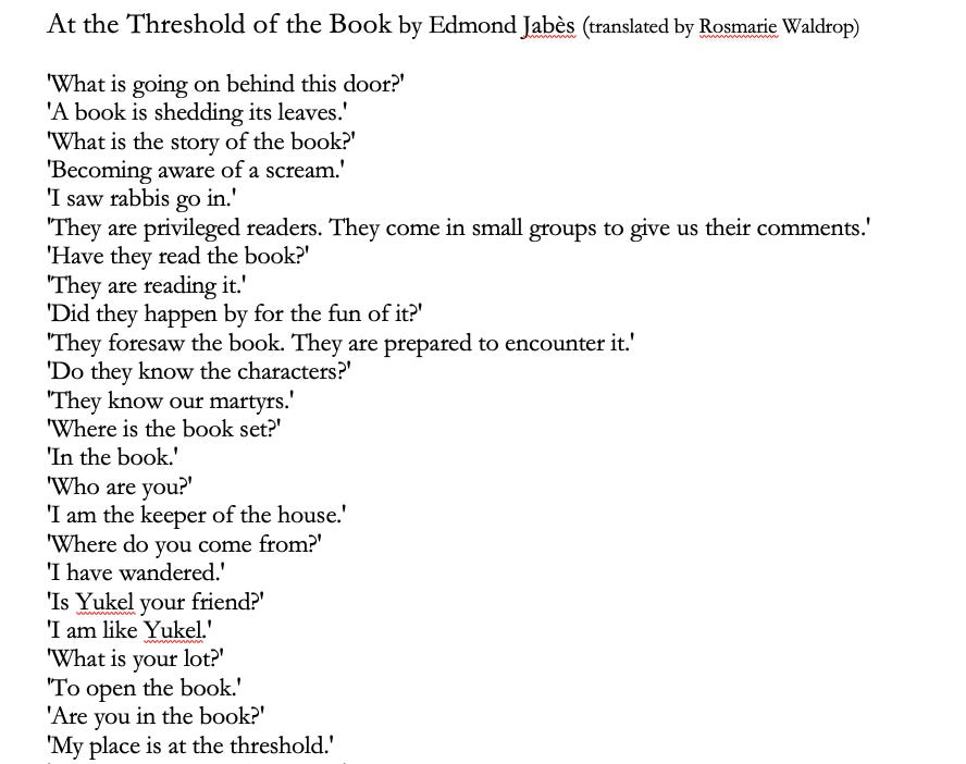 Poets know that language fails. And we write from that awareness. When this process is embraced, inexplicable phenomena can happen. I find this consciousness (this embracing of the limits of language while simultaneously generating meaning from this knowledge of language’s limits) profoundly present in the poetry of the Egyptian Jewish French writer Edmond Jabès (1912-1991). His poems are filled with questions, conversation, snippets of narrative, and mysterious observations all of which suggest humility, uncertainty, knowing that one can’t know. At the same time, his poems reach out to the reader and somehow communicate crucial messages, which lead to more questions…